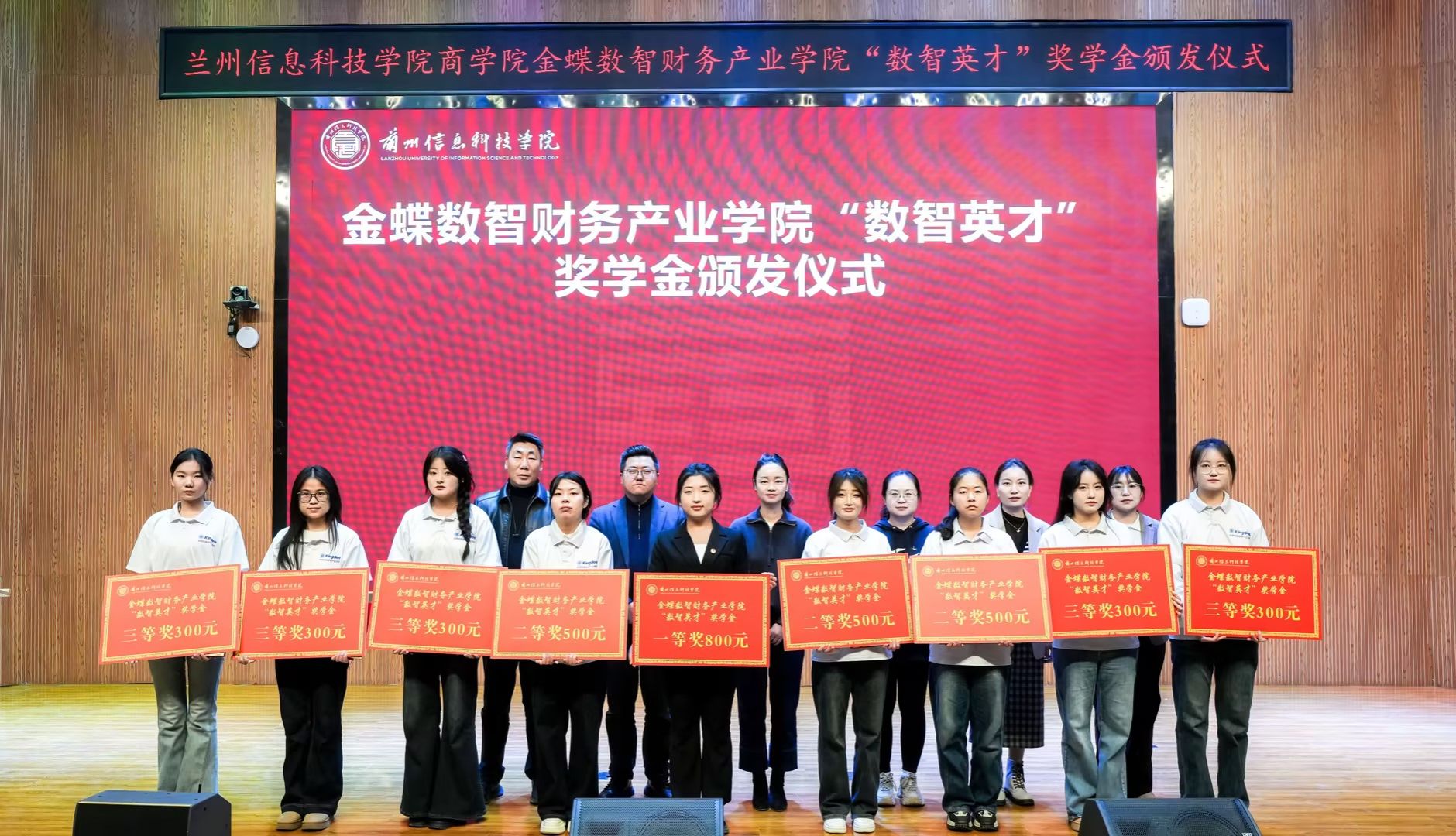2025年12月11日,兰州信息科技学院商学院金蝶数智财务产业学院“数智英才”奖学金颁发仪式在二号报告厅隆重举行。校企双方代表与产业学院全体师生共同出席,见证优秀学子荣获表彰的重要时刻。