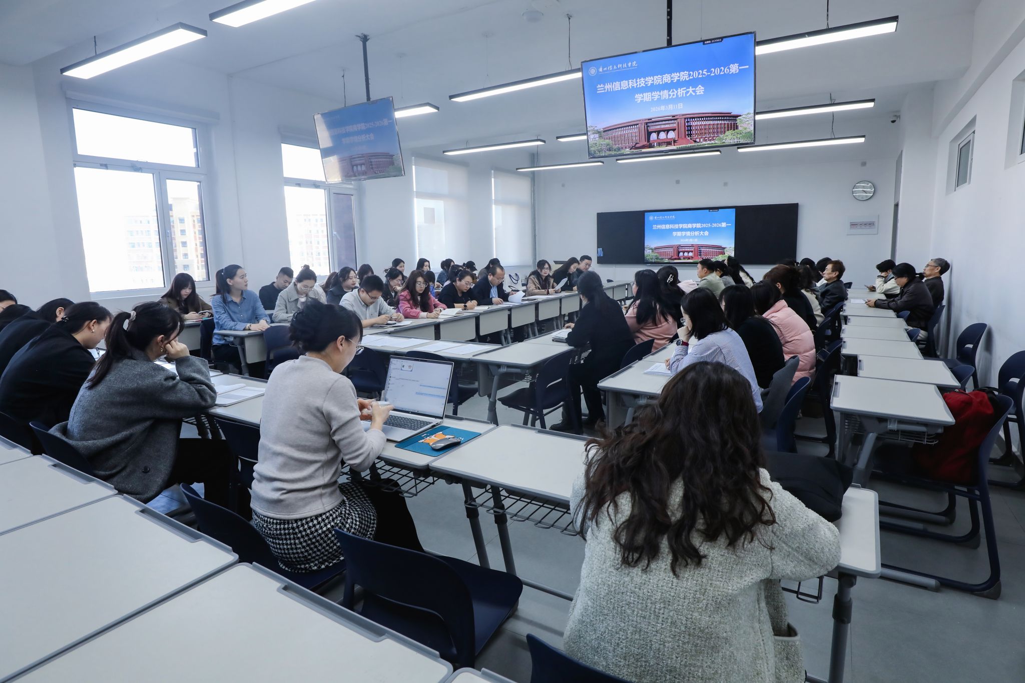 为深入贯彻教育教学质量评估要求,精准诊断教学环节中的问题,兰州信息科技学院商学院于3月11日组织召开了专项学情分析评估会议。会议聚焦学业成绩异常数据,旨在通过深度剖析,将评估结果与教学整改责任压实直接挂钩。教务处处长、商学院全体管理干部、2025-2026第一学期成绩异常教师以及辅导员代表共同参会。