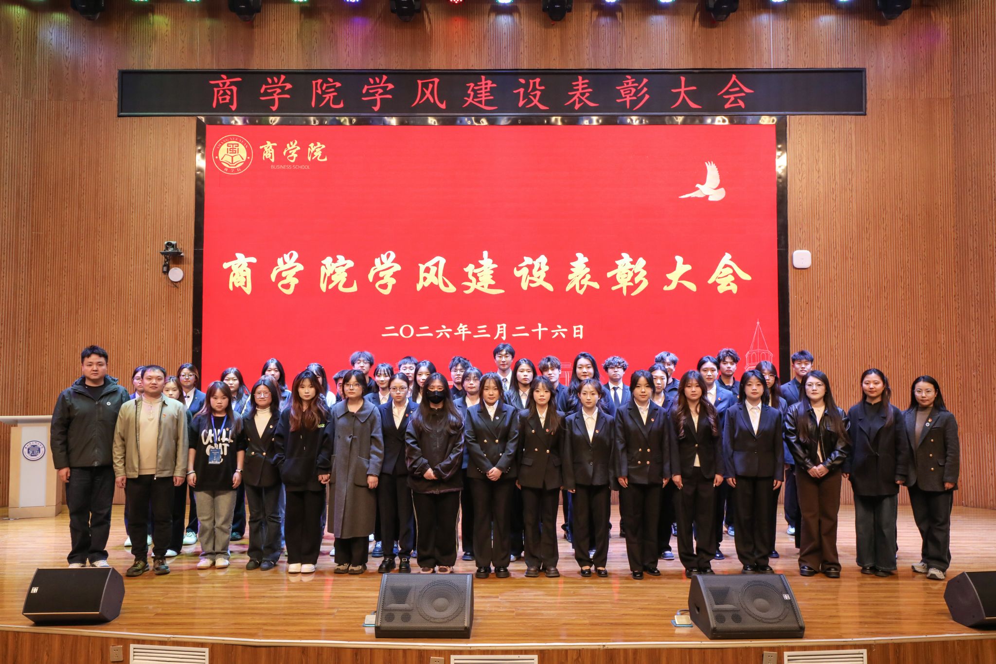 为深化学风建设、树立先进榜样,彰显学院立德树人的初心与商科人才培养的使命,3月26日,商学院在二号报告厅隆重举办学风建设表彰大会。学生发展中心副主任王世斌、王冕,辅导员裴佳乐、高一倩、郭俊秀出席会议。