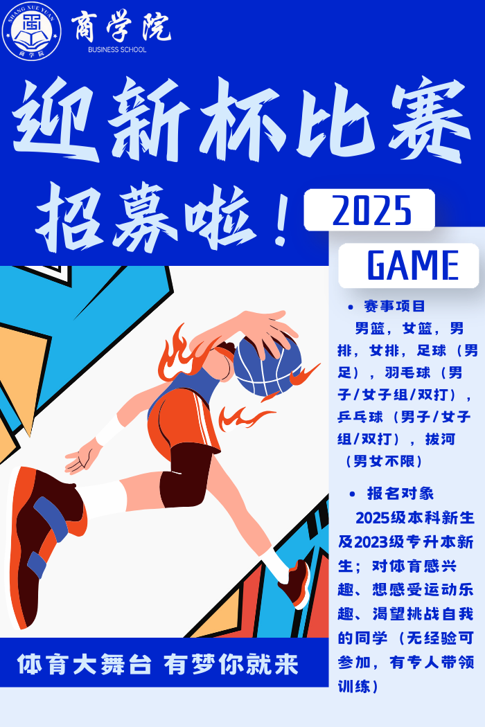 为丰富学生课余生活,营造积极向上的体育文化氛围,促进新生交流与融合,商学院2025年“迎新杯”赛事现正式启动招募工作。