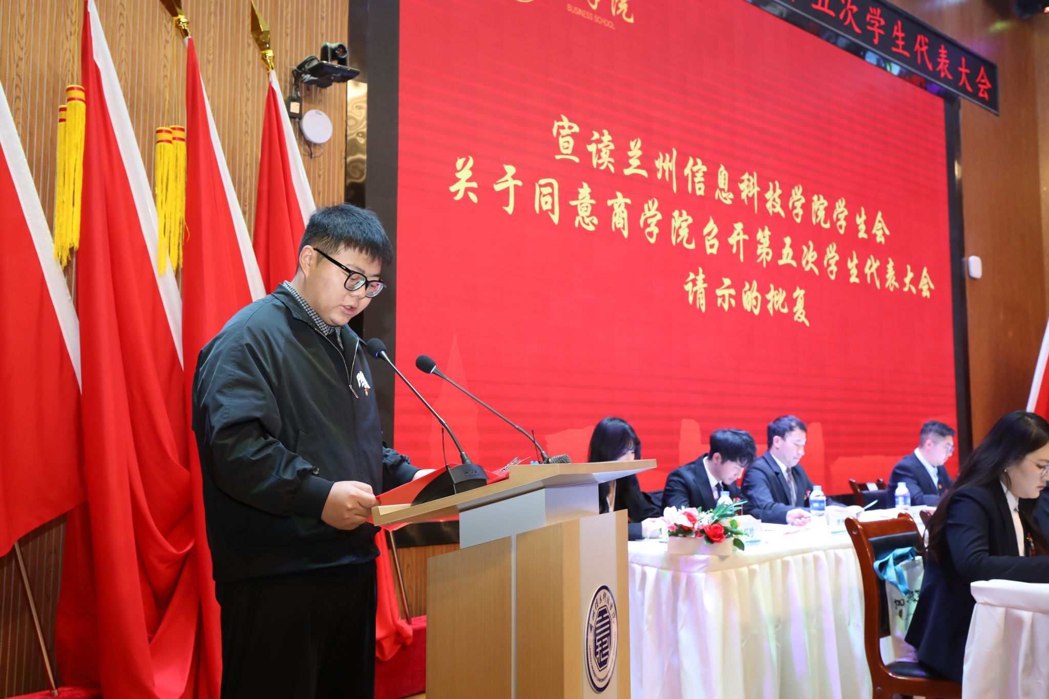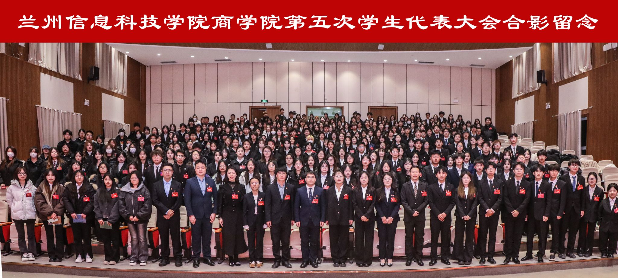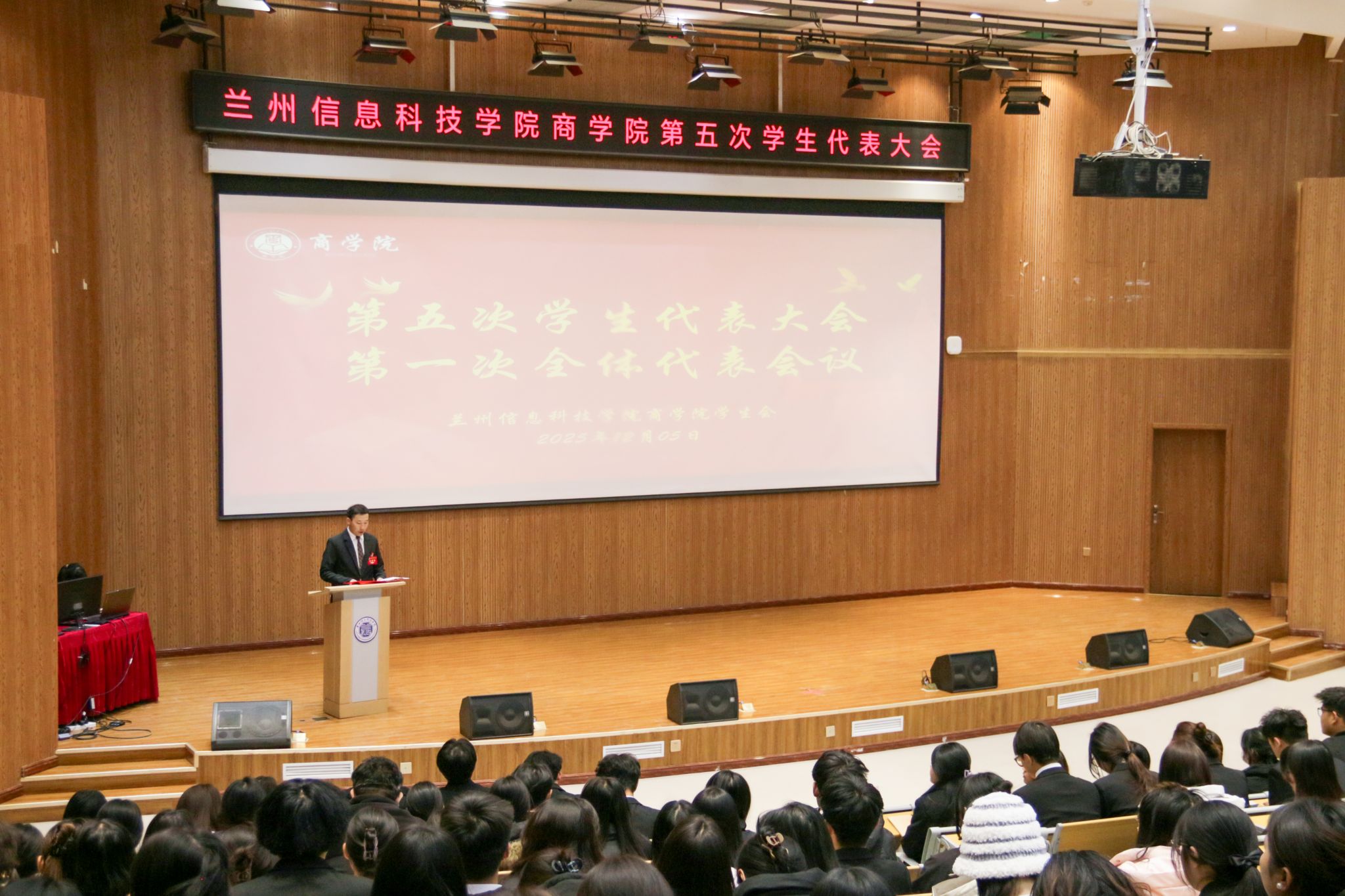 为系统总结学生组织工作成效、夯实服务同学核心根基、选拔培育优秀学生骨干队伍,2025年12月5日17:00,兰州信息科技学院商学院第五次学生代表大会在二号报告厅隆重举行。学校党委学生工作部副部长、校团委书记卢兴华,商学院党委书记杨文晶,团总支书记韦正远,全体辅导员,兄弟学院主席团代表及300余名学生代表齐聚现场,共商学生工作新篇,共绘青春奋斗蓝图。